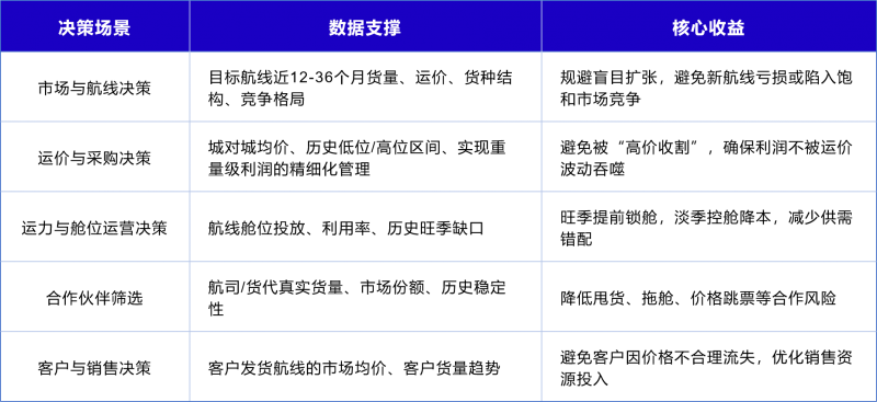 这些数据的应用场景: CargoIS的价值在于嵌入企业核心决策流程,将“分析关键环节、识别更优路线、优化整体策略”三大目标落地为具体行动:
