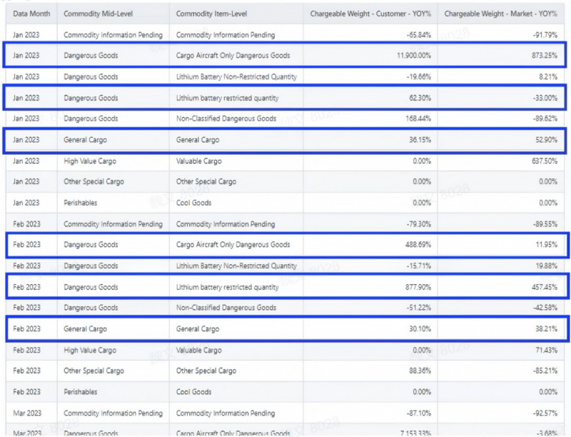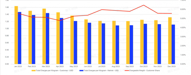 商品细分:在该航线上,危险品表现尤为突出——企业危险品货量基本持平(-0.21%),而市场大幅下降5.53%;企业运价1.23美元/公斤,低于市场1.34美元/公斤。