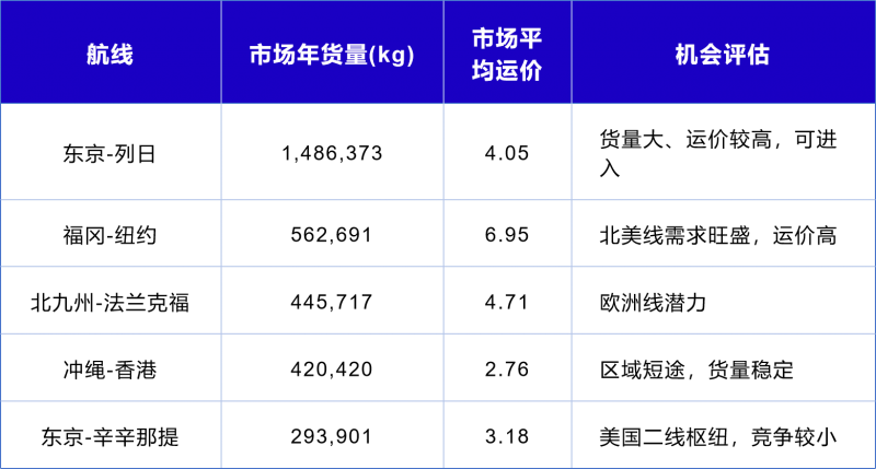 核心洞察:尽管企业运价全年大部分时间高于市场平均(溢价幅度在0.8%-12.5%之间),但市场份额并未随运价波动而剧烈变化,甚至在某些月份(如12月溢价10.5%)份额仍有4.1%。这表明日本-韩国市场对运价溢价并不敏感,客户更看重航班频次、服务稳定性等其他因素。因此,企业无需降价竞争,应维持现有定价以保障利润率,同时加强服务优势宣传,争取份额温和增长。 3.新市场分析:挖掘潜在增长点 在巩固现有市场的同时,企业可利用CargoIS的城市对级别数据,寻找自身尚未参与但具备潜力的新兴市场。例如:该货运企业通过筛选“业务区域内的货量为0但市场货量充足”的航线,发现了多个机会: