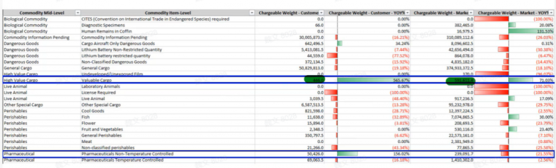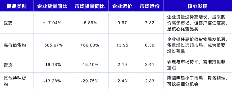 结论:企业应将资源向医药、高价值货物等自身优势明显、增长快的领域倾斜,同时关注特种货物中的潜力点。 2.小项细分分析:深入品类内部,锁定真正增长点 企业进一步利用CargoIS的“商品小项细分”功能,对高价值货物和医药进行下探分析: