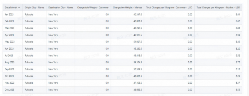 以福冈-纽约航线为例,企业进一步调取了2023年的月度数据,分析其季节性和稳定性: