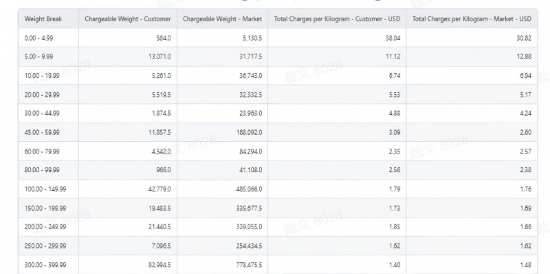数据显示,福冈-纽约航线全年货量稳定在4-5.4万公斤/月,无明显淡旺季,运价虽年初较高但随后回落至6-7美元/公斤区间,属于健康稳定的市场,值得投入资源拓展。 4.优化策略与成果 基于CargoIS的三步分析,企业制定了分层级市场策略: 韩国市场(维持策略):保持现有定价,加强服务宣传,不参与价格战,确保利润率。 优势市场(巩固策略):在美国、中国、泰国等份额高且运价有优势的市场,加大销售力度,扩大领先。 新兴市场(拓展策略):优先启动福冈-纽约、东京-列日航线,试运营并持续监控月度表现,逐步切入。 实施半年后,企业整体市场份额提升2.1%,韩国市场利润率保持稳定,新航线贡献了约8%的增量货量。 5.案例启示 CargoIS帮助企业从全局概览到微观洞察,系统性地评估现有市场、验证市场规律、发掘新机会,将有限的资源精准投放到最具价值的领域,实现数据驱动的战略升级。 案例实证二:公斤级别段分析——拼货策略与谈判筹码的双重价值 一家运营日韩航线(东京-首尔)的货代企业,长期服务于中小型客户,货量分散但整体稳定。通过CargoIS的公斤级别段数据分析,企业发现了此前被忽视的优化空间。 数据揭示:不同重量段的运价差异显著 企业调取了东京-首尔航线2023年全年的分重量段数据,将自身采购价与市场平均进行对比: