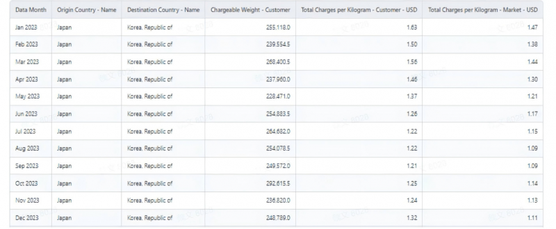 关键发现:韩国市场表现异常——企业份额仅5.52%,在所有主要市场中排名靠后,但采购价却高出市场平均9.8%,是唯一一个运价高于市场的目的地。这引发了两个可能的假设:要么是定价过高导致份额流失,要么是该市场对价格不敏感,企业可以维持高价而不影响份额。 2.市场敏感性分析:验证市场规律 为验证假设,企业利用CargoIS时间轴功能,调取了2023年日本-韩国航线的月度数据,追踪自身份额、运价与市场平均运价的动态关系: