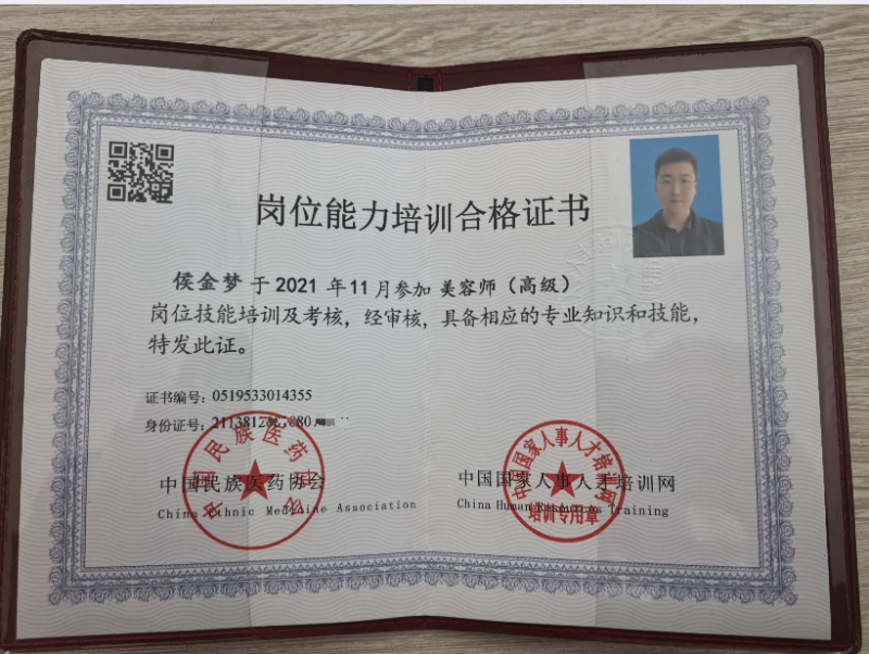 图2:高级美容师证书 侯金梦深知,护肤行业日新月异,新的产品和技术不断涌现。因此,他保持着持续学习的习惯,定期参加行业培训和交流活动,及时了解最新的护肤理念和技术动态。这种对专业的执着追求,使他的专业知识始终保持在前沿水平。