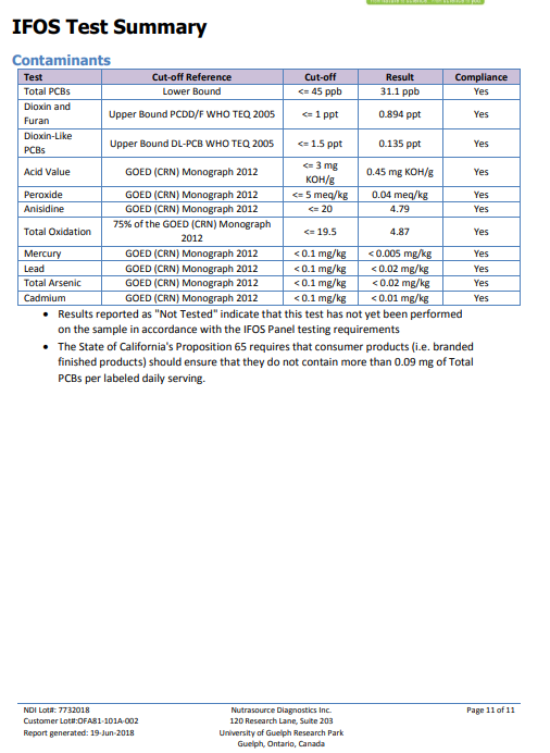 图:Omega-3脂肪酸的来源及结构形式 3.3 纯净鱼油,获国际权威认证 98nTG天然高吸收鱼油经过IFOS、Eurofins等第三方检测,重金属、多氯联苯等污染物均低于国际食品鱼油标准(见图4);同时,MOAH检测值MOAH C10-62含量<1.0mg/kg(见图5),低于欧盟2030年的控制目标5mg/kg,也低于国际鱼油组织抽检中MOAH C10-50的含量——平均值为4.93mg/kg(见表1)。98nTG鱼油凭借其卓越的品质,通过了IFOS、NSF、FOS、MSC等国际权威认证。