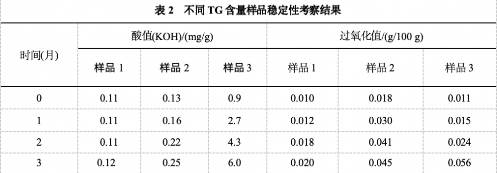 表1:国际鱼油组织抽检情况(数据来源GOED) 3.4 高稳定性,延长产品货架期 鱼油的氧化稳定性是影响产品质量和用户体验的关键。TG结构是自然界鱼油的天然存在形式,稳定性最强,研究表明,TG含量越高的鱼油,其稳定性越强[]。98nTG鱼油的加速稳定性试验也获得了同样的结果:通过3个月的加速试验显示,样品2(TG含量90.8%)的酸值和过氧化值有所增加;样品3(TG含量64.09%)的酸值和过氧化值显著增加,且酸值变化较大,说明产品稳定性较差;样品1-98nTG(TG含量98.23%)酸值和过氧化值几乎没有变化,说明98nTG的稳定性更好,也说明鱼油的TG含量越高产品稳定性越好。