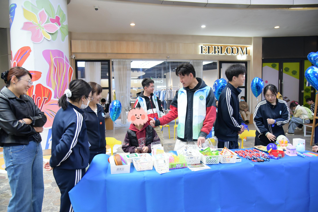 活动当天,志愿者们早早来到康复中心,协助工作人员布置户外活动场地,为孩子们营造温馨热闹的活动氛围。本次活动特别邀请了外界同龄儿童一同参与,通过互动游戏搭建孤独症儿童与社会接触的桥梁,帮助他们更好地融入集体、认识世界。志愿者们分工协作,有的引导孩子们参与打气球、绘制风筝等趣味活动,耐心陪伴他们完成作品;有的协助布置“星星手作市集”,帮助孤独症儿童将自己制作的手工艺品进行展示与售卖,让孩子们通过自己的劳动获得成就感,也在实践中锻炼沟通与社会适应能力。