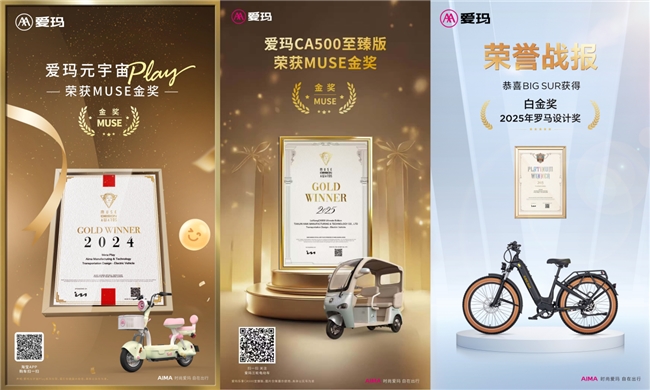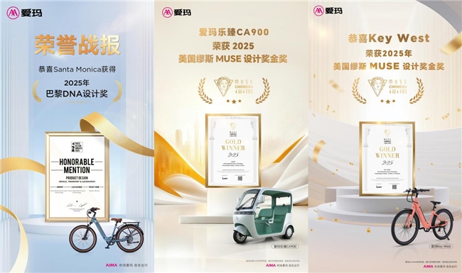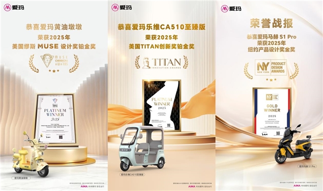 2025年,对于中国电动两轮\三轮车市场是极具里程碑意义的一年,这一年里新国标落地、以旧换新等政策集中发力,推动行业完成合规化蜕变,同时技术革新与出海进程提速,行业格局、产品生态和市场方向都迎来深度重塑。而对行业头部品牌爱玛来说,这同样是不平凡的一年,拿奖拿到“手软”的一年,尤其在产品奖项领域,2025更是堪称爱玛的“丰收年”。 2月,爱玛元宇宙Play获得美国缪斯设计奖(MUSE Design Awards)金奖; 4月,爱玛乐享CA500至臻版获得美国缪斯设计奖(MUSE Design Awards)金奖; 4月,爱玛Q5获得法国设计奖(French Design Awards,简称FDA)金奖; 6月,爱玛BIG SUR获得罗马设计奖; 到了第三季度,爱玛电动车更是在国际、国内权威评奖活动中加快了“攻城略地”步伐。爱玛Santa Monica获得2025巴黎DNA设计奖;爱玛黄油墩墩电动车获2025年度MUSE Design Awards(缪斯国际设计奖)铂金奖;为北美市场初学者设计的轻量级新品爱玛Key West与爱玛乐臻CA900休闲电三轮获得2025年度MUSE Design Awards(缪斯国际设计奖)金奖;爱玛乐维CA510休闲电三轮获2025美国TITAN创新奖金奖;爱玛马赫S1pro获2025NY Product Design Awards(纽约产品设计奖)金奖......... 盘点爱玛电动车2025获得的奖项,可以说都极具含金量。美国TITAN创新奖、MUSE Design Awards(缪斯国际设计奖)、与NY Product Design Awards(纽约产品设计奖)均由国际奖项协会(IAA)主办。这几项评奖均名列全球创意领域最具影响力的国际奖项行列,一向以高难度与高标准的审核程序与评判宗旨而广受业界认可,其使命不仅在于表彰和推广获奖作品,更是致力于提升全球创意标准、激发设计和创意领域的持续创新。