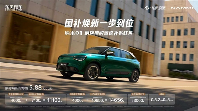 当时间步入2026年,朋友圈里晒出的不仅是风景与聚会,更是对生活品质的追求——人们不再仅仅关心“去哪里”,更在意“如何抵达”。在这个时代,一辆车早已超越了代步工具的范畴,它成为生活态度的延伸,是懂你、伴你的出行伙伴。如果你正在寻找这样一位伙伴,那么被十万用户誉为“精致大宝贝”的2026款东风奕派纳米01,正以满满诚意走进你的视野。它积极响应国家以旧焕新政策,推出限时焕新指导价5.88万元起,更叠加三重豪礼:国补至高10656元、厂家补贴至高4000元、限时购置税补贴红包至高3000元,让焕新座驾真正实现一步到位。