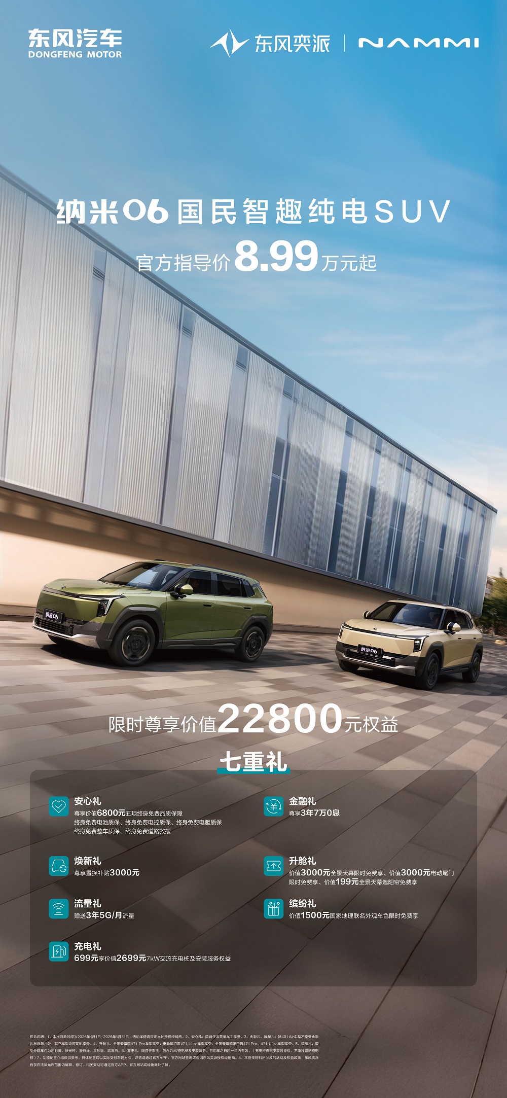 “国民智趣纯电SUV”纳米06凭借强大的产品实力,在2025年实现了市场与口碑的双丰收。它不仅在12月单月出口量突破4000辆,展现出强劲的海外市场竞争力,更凭借行业领先的动力、智能水平表现,荣获“世界十佳电驱动系统”与“世界十佳汽车智能座舱”两项重磅奖项。2026年开局,纳米06推出限时尊享价值22800元权益七重礼,官方指导价8.99万元起,助力用户稳妥出行,安心过冬。