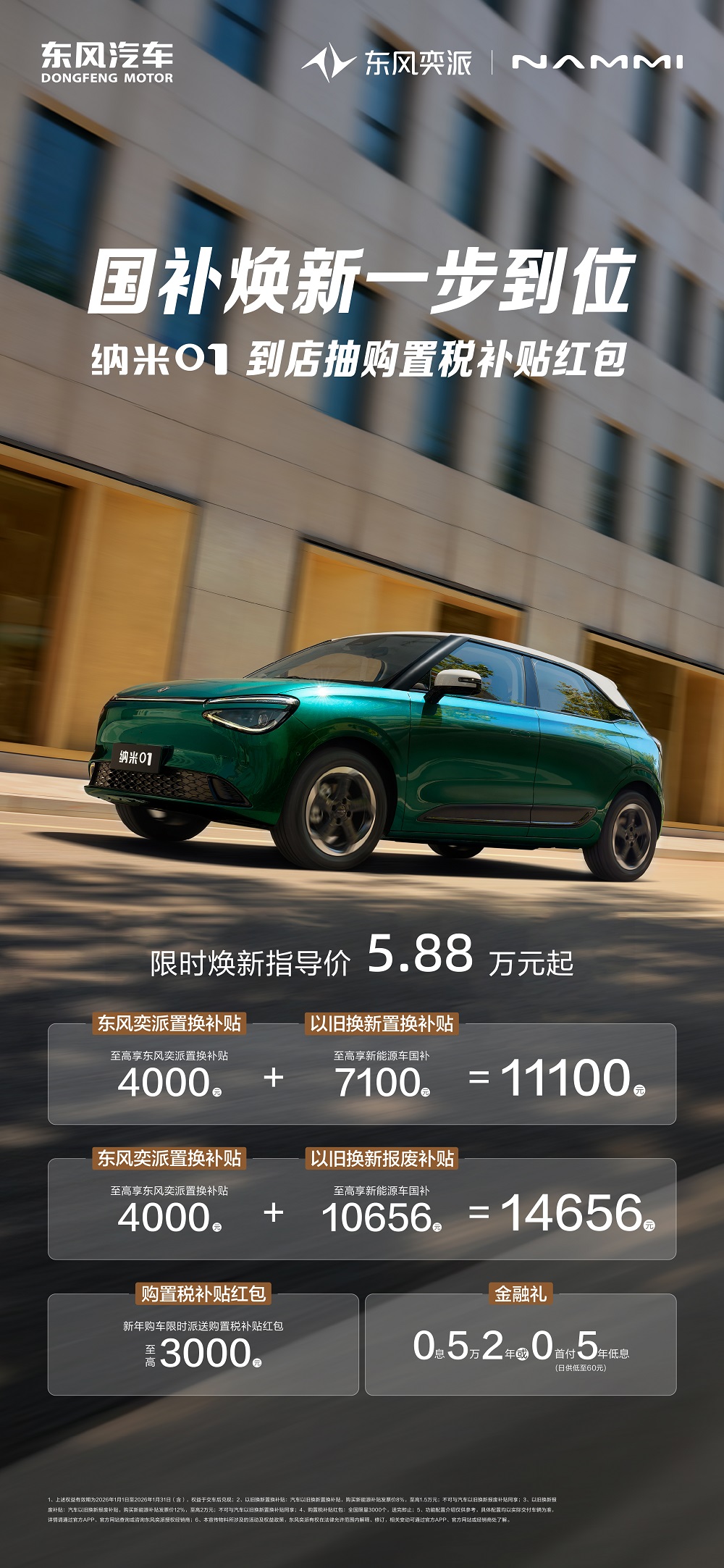 “大美智能国民车”纳米01在2025年同样持续热销,凭借极具个性的潮流气质,成为用户精致的生活搭子,累计销量已突破11万辆。为了让更多追求潮流与实用的用户享受到政策红利,2026年,纳米01限时焕新指导价5.88万元起,更有国补至高10656元+厂家补贴至高4000元+限时购置税补贴红包至高3000元,三重豪礼叠加,助力这款潮流单品持续为更多用户带来精致生活。