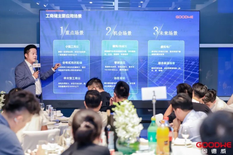 固德威储能拓展总监李栋随后分享《固德威源网荷储智解决方案》,详细介绍了公司在用户侧储能方面的解决方案。他分别从户用、工商业及地面三个维度展示了固德威的丰富产品线和成功案例,并强调了公司在储能安全、系统集成及智能化管理方面的优势。他的分享让与会嘉宾对固德威在用户侧储能领域的深厚积淀和创新成果有了更直观的认识。