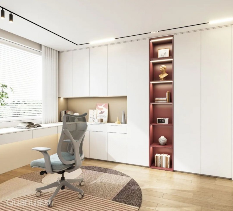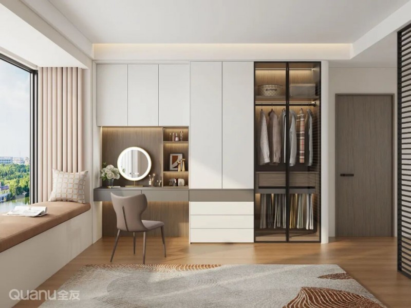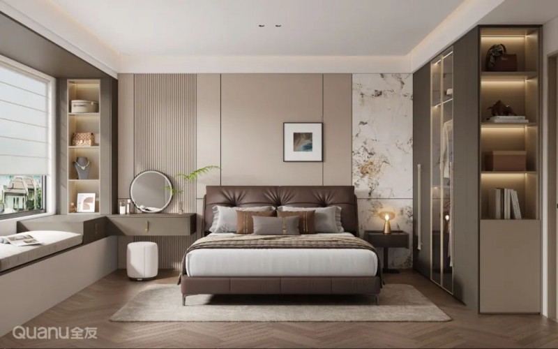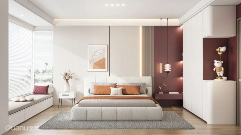 ②通过延伸、叠加等设计手法,连接飘窗定制立柜、书桌或梳妆台,强化卧室实用功能。