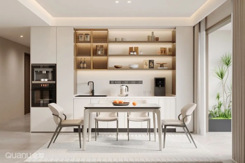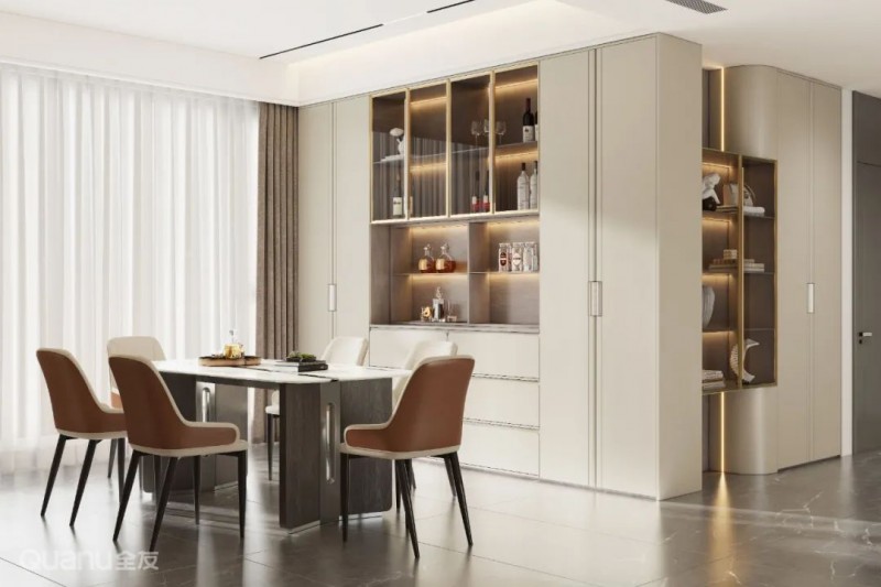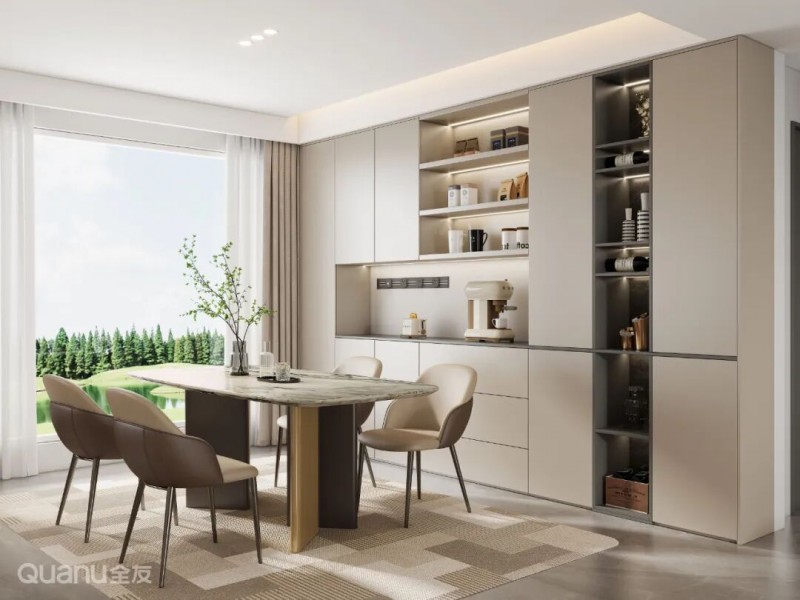 改造方案: ①采用餐边柜+酒柜一体化设计,仅保留少量玻璃柜门展示常用酒类、酒具,能同时满足餐具、小家电及酒类酒具等收纳需求,提高空间利用率;
