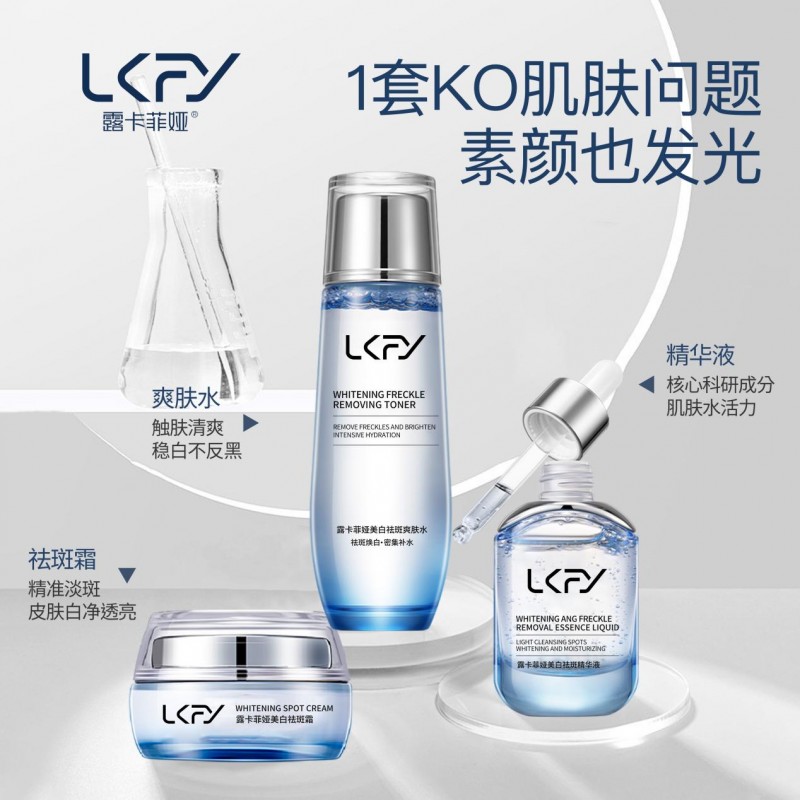 四段式祛斑模式,全方位阻击斑点 露卡菲娅祛斑套装采用了先进的四段式祛斑模式,全方位阻击斑点,让斑点无处遁形。 第一段,阻断黑色素传输。通过虎杖根提取物等成分,阻止黑色素向角质形成细胞传递,从源头上遏制色斑加重。这就好比在黑色素的运输通道上设置了一道关卡,让其无法顺利到达肌肤表面。 第二段,分解代谢已生成的黑色素。光果甘草提取物等深入肌肤底层,将已经形成的黑色素分解,并加速其排出体外。就像一位勤劳的清洁工,将肌肤内的黑色素垃圾清理干净。 第三段,抑制黑色素再生。烟酰胺和天女木兰提取物等成分通过抑制酪氨酸酶活性,防止新的黑色素生成。这就像是给黑色素的生产工厂按下了暂停键,让其无法继续制造新的色斑。 第四段,修复肌肤屏障。积雪草提取物、透明质酸钠等成分修复受损的肌肤屏障,增强肌肤的自我保护能力,让祛斑效果更持久稳定。就像给肌肤穿上了一层坚固的铠甲,抵御外界的各种伤害。
