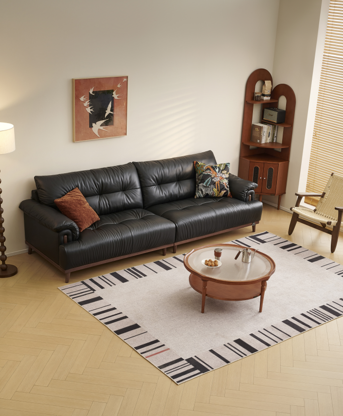 复古黑色调搭配饱满座包,如琴键般静谧舒适,松弛感自然流露。1.5mm进口头层牛皮,色泽持久,柔韧耐用。分段式靠包设计,精准承托头颈腰背,倚靠更舒适。37cm加宽扶手,便于置物与搭手。座包、靠包与扶手填充三层海绵,柔弹释压,倚靠更放松。 香蕉派沙发