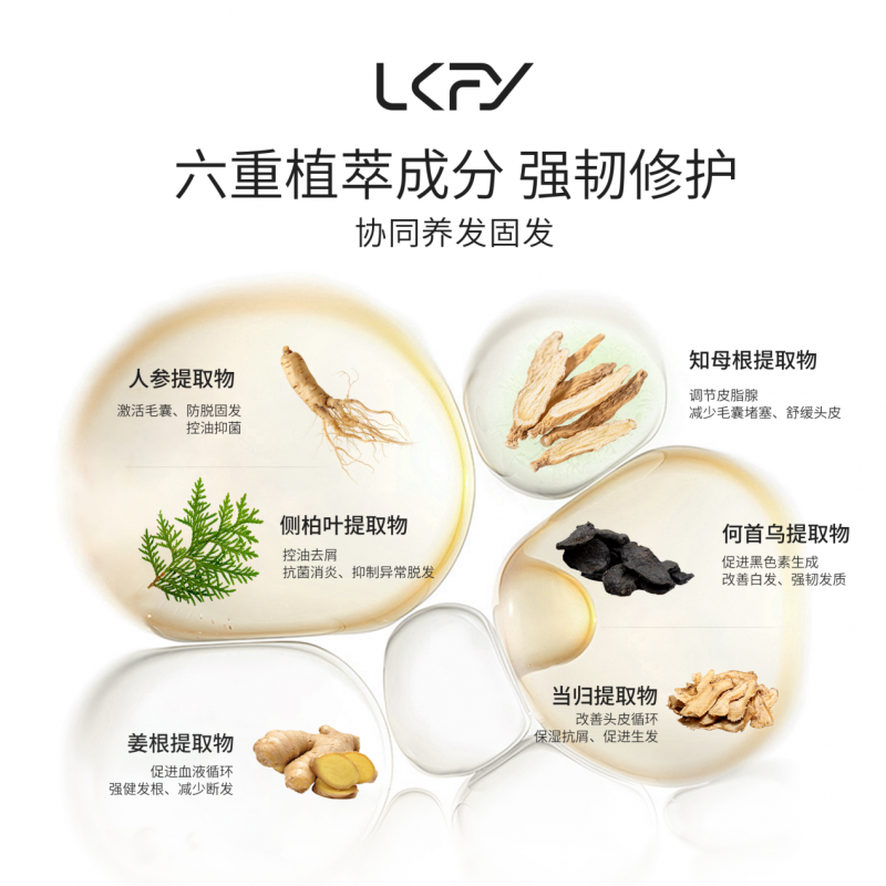 更难得的是,露卡菲娅在成分上坚持“安全无负担”。市面上不少防脱产品为了追求即时效果,会添加硅油、酒精等刺激性成分,长期使用反而会破坏头皮屏障,加重脱发。而露卡菲娅防脱洗发水完全摒弃这些有害添加,转而采用人参、当归、知母、何首乌、侧柏叶、姜根等天然植萃配方:人参和当归能深层滋养毛囊,为发根输送养分,减少因“营养不足”导致的断发;侧柏叶可调节头皮油脂分泌,改善油头“一天一洗还黏腻”的问题,避免油脂堵塞毛囊;姜根则能促进头皮血液循环,唤醒“沉睡”的毛囊,为头发生长营造健康环境。天然成分搭配独家专研防脱因子,既保证了温和性,又让防脱效果更精准——从“减少掉发”到“稳固发根”,再到“滋养发丝”,形成完整的护发闭环。