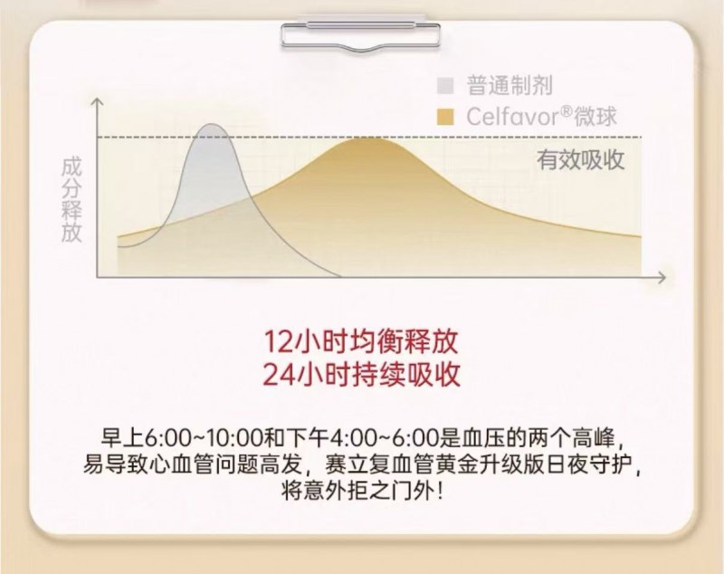 ▲赛立复血管黄金升级版 这款产品的核心突破在于“双还原辅酶协同系统”。它首创将还原型辅酶Ⅰ(NADH)与还原型辅酶Q10协同应用,使活性分子无需在体内转化即可直接吸收,生物利用率较传统产品提升约1.4倍。这意味着补充后的能量更快进入细胞、作用更持久。 更重要的是,血管黄金升级版搭载了赛立复自主研发的Celfavor®微球控释技术。这种微球载体可在体内实现12小时均衡释放,24小时持续吸收,并在血管负荷最高的两个时段——早晨和傍晚——持续供给活性营养成分,让血管在关键时刻始终有“防护力”。