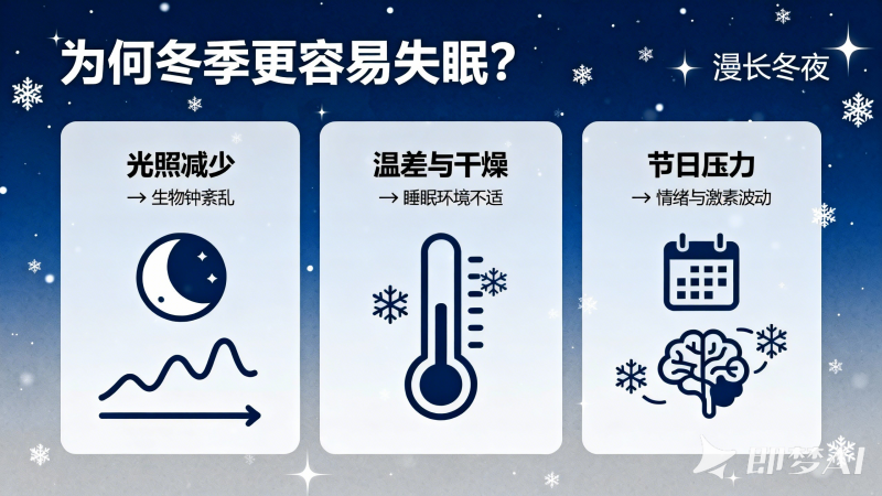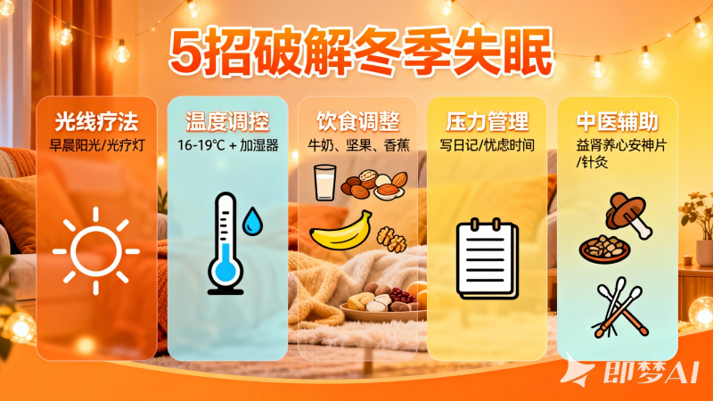 首先,冬季光照减少是生物钟的隐形杀手。研究发现,充足的光照,特别是白天的自然光,对于维持褪黑素分泌的稳定节律至关重要,光照不足则会导致其分泌紊乱,进而打乱睡眠周期。冬季日照时间缩短,因此会直接影响人体内褪黑素的分泌节律。。 其次,冬季室内外温差加大,人体需要更多能量维持恒温。过热或过冷的睡眠环境都会干扰睡眠周期。此外,冬季干燥的空气可能导致呼吸道不适,进一步影响睡眠质量。 最后,节日压力是失眠的隐藏推手。年末节庆集中,工作压力、社交应酬、家庭聚会等增加,容易导致情绪波动和压力增大。压力激素皮质醇水平升高,直接影响睡眠-觉醒周期,使人难以放松入眠。 5招教你科学破解冬季失眠 对于冬季失眠,首先可以选择光线疗法、温度调控、饮食调整、缓解节日压力、服用药物等方式。