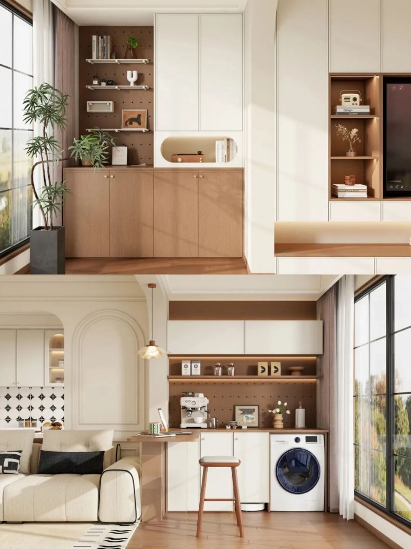 阳台 阳台一侧为储物柜与装饰墙的结合,美观且实用;另一侧作为生活区,完美嵌入洗衣机与扫地机器人。定制的L型台面形成了一个休闲小吧台,无论是临时办公还是品茶小憩,都能在此找到惬意。