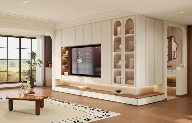 客厅 客厅打造L型满墙电视柜,提供了堪称奢侈的储物容量,满足家庭囤货所需,无需为收纳而断舍离。一字型延伸台面便于放置路由器等设备,让各类线缆隐藏无踪。圆弧造型的玻璃柜门,既防尘又透光,在提升空间通透感的同时,也让整体颜值大幅跃升。