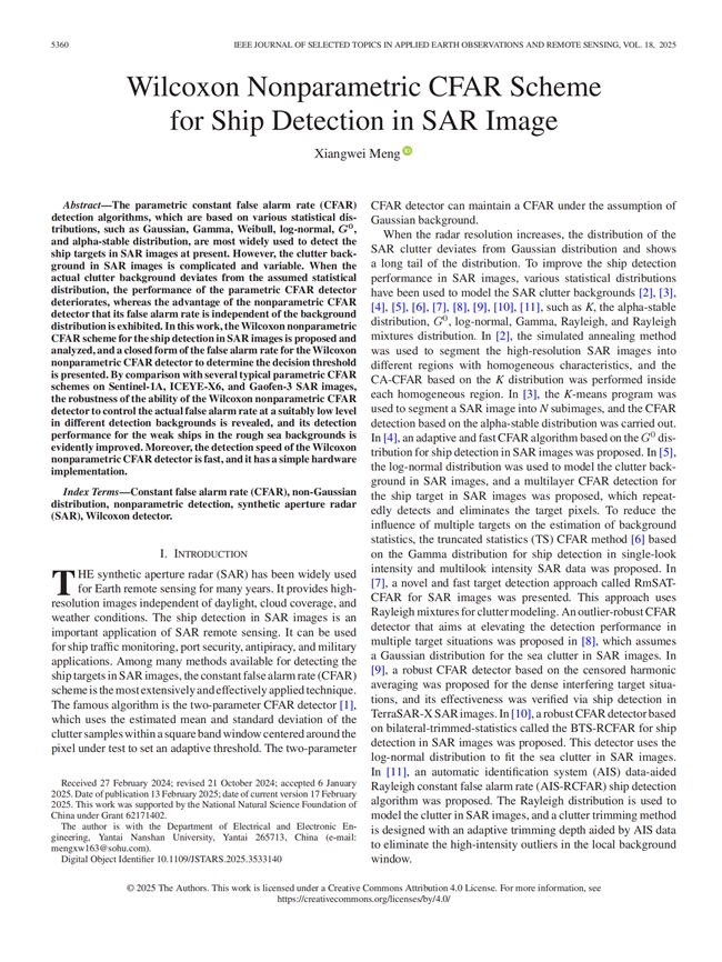 近日,烟台南山学院孟祥伟教授团队在国家自然科学基金项目“基于非参数CFAR方法的SAR图像中舰船目标检测”中取得突破性进展。该研究创新性提出Wilcoxon非参数恒虚警率检测方法,成功攻克合成孔径雷达(SAR)图像复杂背景下的船舶检测技术瓶颈,相关成果已发表于《电子与信息学报》及国际遥感领域顶级期刊《IEEE应用地球观测与遥感精选期刊》,标志着我国在该领域的研究达到国际先进水平。