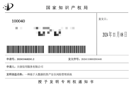 随着数字化时代的深入发展,数据安全和技术创新已成为各行各业关注的焦点。天创信用始终致力于技术研发和创新,通过不断的技术迭代和优化,为行业提供更安全、更高效的信用科技解决方案。近日,天创信用传来好消息,其最新研发的两项发明专利“一种数据权限管理方法及相关装置”和“一种基于大数据的资产安全风险管理系统”正式获得国家知识产权局授予的发明专利权通知书。这一喜讯标志着天创信用在数据安全与技术创新领域取得了新的突破。 此次获批的两项发明专利,正是天创信用在数据安全和技术创新领域取得的最新成果。其中,“一种数据权限管理方法及相关装置”专利,针对大数据平台访问控制和权限管理的难题,提出了创新性的解决方案。在当今数字化时代,企业大数据平台和分布式系统广泛应用,数据权限管理的重要性不言而喻。传统的密钥管理方式复杂,数据泄露风险较高。而天创信用的这项专利,能够简化权限管理流程,提升管理效率,从根本上增强数据的安全性,为企业大数据的稳定运行筑牢了坚实的防线。