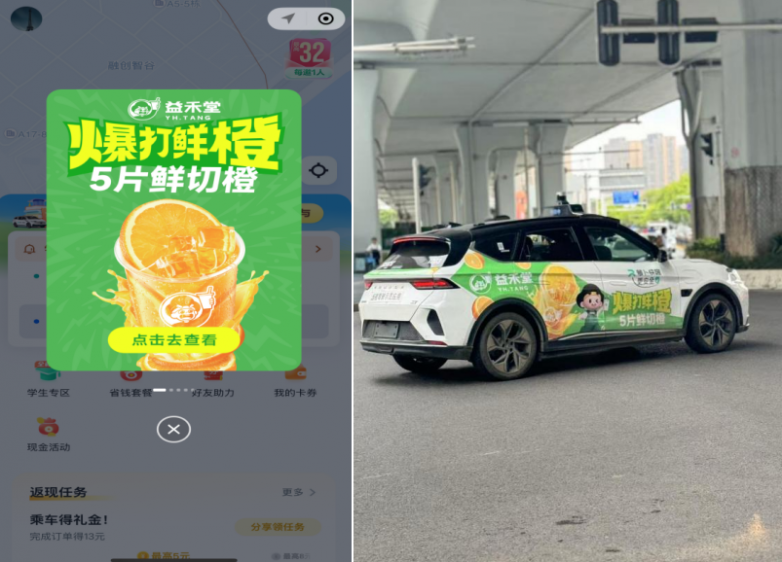一、跨界碰撞:无人驾驶X新茶饮,一场关于“移动体验”的革新 益禾堂与萝卜快跑的合作,打破了传统茶饮品牌跨界联名的范式。不同于以往常见的IP联名或区域快闪店,此次合作深度融合“科技出行”与“茶饮文化”,借助萝卜快跑L4级自动驾驶技术,打造出可移动、可互动、可触达的品牌体验空间。 车身整体以益禾堂明星产品“爆打鲜橙”为主题进行视觉包装,醒目且具有强烈辨识度,车辆行驶过程中形成流动广告效应,极大提升了品牌曝光频次与视觉冲击力。车内还随机放置了益禾堂定制周边产品,乘客在体验无人驾驶科技的同时,也有机会收获来自益禾堂的惊喜礼物,增强了品牌与消费者之间的情感链接。此外,益禾堂品牌IP“堂堂”也以人偶形象现身自动驾驶舱,通过拟人化、场景化的互动设计,进一步拉近与年轻群体的距离,传递出“好玩、会玩”的品牌形象。