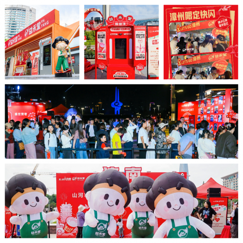产品力与情感共鸣的完美结合,直接转化为了惊人的销量。数据显示,双节期间“小红杯”益禾烤奶售出超270万杯。除了“小红杯”新品表现突出,益禾堂另两款经典产品也展现出持续的生命力:薄荷奶绿与珍珠奶茶分别售出超213万杯和101万杯。 深度融合文旅,拓展“茶饮+零食”消费场景 如果说“小红杯”提供了破圈的“种子”,那么益禾堂与全国多地文旅场景的深度融合,则为这颗种子的生长提供了最肥沃的“土壤”。这标志着其营销重心从“渠道渗透”转向了“场景占领”。 在重庆解放碑步行街、福建漳州古城、山西平遥古城、山东泉城广场等地,益禾堂不再是等待顾客上门的门店,而是主动融入文旅体验的场景化服务提供者。它通过设置主题快闪店、结合非遗体验(如木板年画、剪纸)、策划互动游戏等方式,将“喝奶茶”这一消费行为,无缝嵌入游客“逛景区”的全流程中。