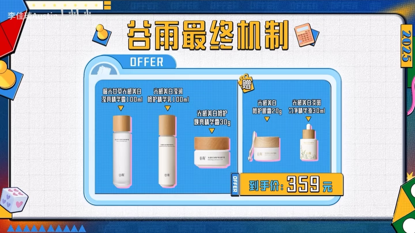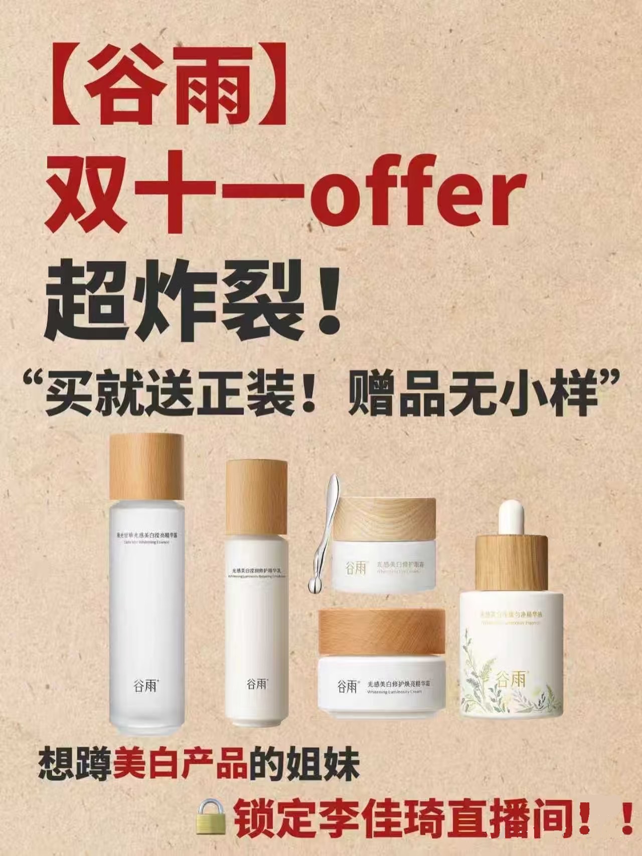 卓越美白力:根源抑黑,精准打击 •「极光甘草」美白黑科技:作为国内最早深耕光甘草定的品牌,谷雨花了 18 年攻克原料提纯难题,最终推出的「极光甘草」这一具备完全自主知识产权的核心美白原料,通过熔融结晶提纯技术(专利号:ZL 2023 1 1064877.2)将光甘草定纯度提升至99%行业最高水平,结合28纳米包裹体与靶向递送技术,使成分透皮吸收率提高3.4倍,实现高效美白。 •抑黑实力认证:经SGS权威实测,极光甘草能在72小时内减少86.62%黑色素,抑黑率高达115.54%,从源头阻断黑色素生成。 •28天焕白效果:新增蛋白透光科技,协同欧蓍草、依克多因、VCE等成分抵御糖化、氧化、光损导致的暗沉。经SGS 28天实测,淡斑效果提升15.9%,白皙度提升49.13% 强大修护力:强韧屏障,舒缓敏感 •全皮层修护矩阵:添加神经酰胺NP、β-葡聚糖、羟基积雪草甙等修护成分,针对性解决敏感肌“干、敏、红”问题。 •敏感肌安心认证:中科检温和性测试显示,30位敏感肌受试者均无不良反应,真正实现“边修边白” 市场认可,国货美白第一品牌 谷雨已获得多项权威认证: •2024年荣获两大国际权威调研机构(欧睿&弗若斯特沙利文)的美白第一双认证「全国第一的中国美白品牌」; •2025年获得中国香妆“国货美白护肤第一品牌”市场地位的权威认证;并正式加入人民日报「品牌强国计划」,成为与茅台、京东、安踏等标杆企业同列入选的唯一护肤品牌。 🛒 李佳琦双十一专属机制(抄作业版) 谷雨光感套组:5 件正装一步到位,国货美白性价比天花板! •包含:光感水 100ml + 光感乳 100ml + 淡斑瓶 30ml + 美白奶罐 30g + 光感美白修护眼霜 20g •到手价:359 元 •搭配逻辑:从洁面后补水、锁水,到深层淡斑、局部美白,再到眼周护理,全流程覆盖换季美白需求,省心高效!