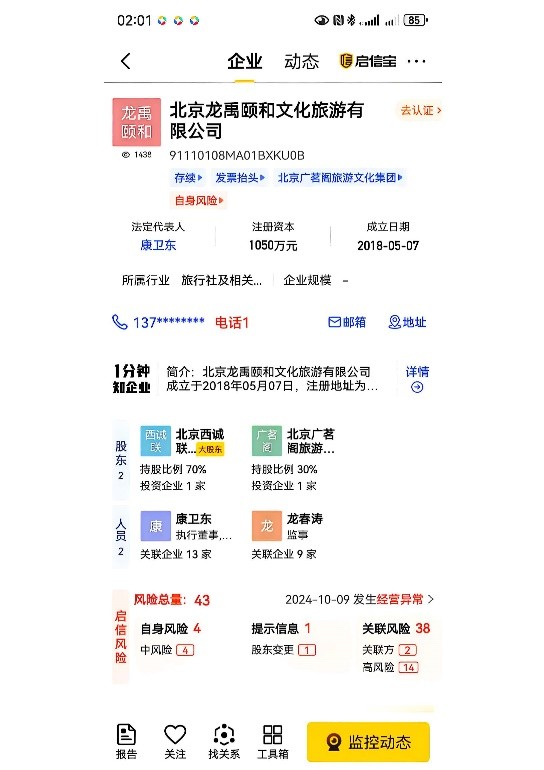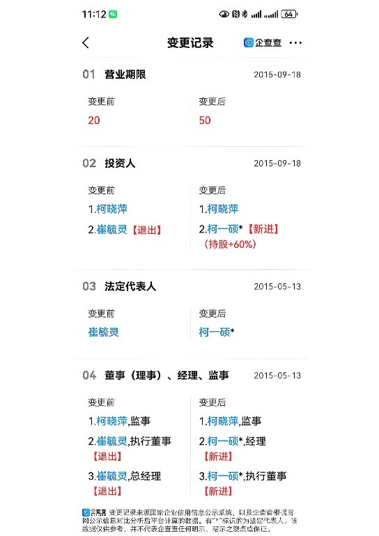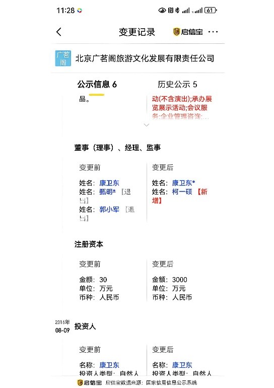 他是北京龙禹颐和文化旅游有限公司的法定代表人,这家公司注册资本1050万元,做的是水系旅游的生意;还100%持股北京西诚联体育文化有限公司,操盘着垒球社等体育项目。更值得留意的是,北京广茗阁旅游文化发展有限责任公司的变更记录显示,自2016年起,康卫某就担任这家公司的执行董事、法定代表人,当年8月,公司注册资本从30万元一下增至3000万元,他依旧是自然人投资人,也就是在这一年,柯家的柯一硕才开始和这家公司产生关联。更让人揪心的是,网上但凡带“广茗阁”字样的公司,几乎全处于被执行、被限高的状态。