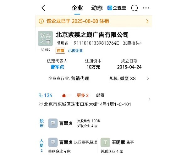 要理清这事儿,得从更早的一份租赁合同说起。瑞可金公司和北京紫禁之巅广告有限公司(法定代表人曹某某)签过租房协议,把西城区鼓楼西大街61号那27间房、总共397平方米的场地租给了紫禁之巅,租期从2018年11月1日到2028年12月1日,现在还在存续期里,也没有任何解除条款。而二哈文化的法定代表人董总,代表紫禁之巅签署的该协议。这才有了二哈文化和听云轩的合作。更有意思的是,康卫某曾在北城另一个相声团体班主“君不君”的直播里,自曝“二哈”这个字号是他起的,当时还调侃称:“第二个嘻哈(包袱铺)”明眼人一看就知道,他在这串合作链条里,掺得有多深。 可变故来得猝不及防。2025年8月8日,紫禁之巅公司办了简易注销。有人说,这和后来传闻要入驻的喜笑会有关,可喜笑会官宣“二进宫”广茗阁是在8月底9月初,和公司注销压根搭不上边。即便紫禁之巅注销了,按法律规定,公司股东也能接着行使租赁协议里的权利,这份租赁合同,可没那么容易失效。