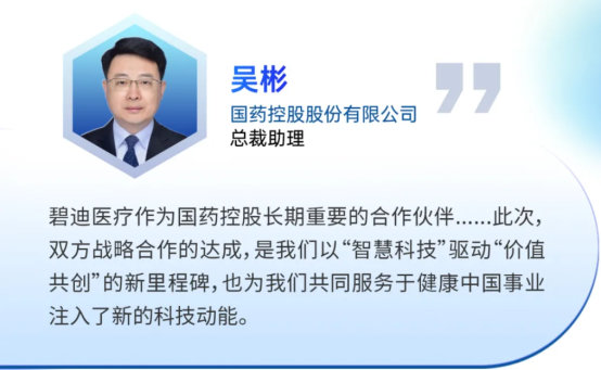 在国药控股股份有限公司总裁助理吴彬先生和碧迪医疗大中华区人力资源及数字化传播副总裁吴珊珊女士及双方同事的见证下,碧迪医疗大中华区药物管理解决方案业务部负责人兼业务发展副总裁金驾先生与国药控股医疗器械有限公司董事长王怡然先生代表双方签约。