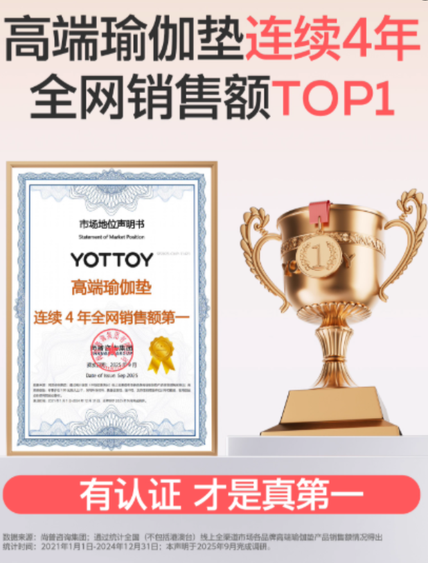 山式站立、下犬式、束角式、四柱支撑……在全民健身的浪潮中,越来越多的人通过这些经典的瑜伽动作,在方寸之间寻找身心的平衡。而承载着每一次舒展、每一次呼吸的那张瑜伽垫,正成为连接人与运动的温暖纽带。在众多瑜伽装备品牌中,有一个名字始终以稳健而温暖的姿态,走在行业前列——YOTTOY 优特。因在科学运动推广及公益赛事助力上的持续投入,YOTTOY连续四年斩获高端瑜伽垫品类全网销售额第一。以专业的产品力与深植于品牌内核的社会责任感,重新定义了何为“有温度的领军者”。