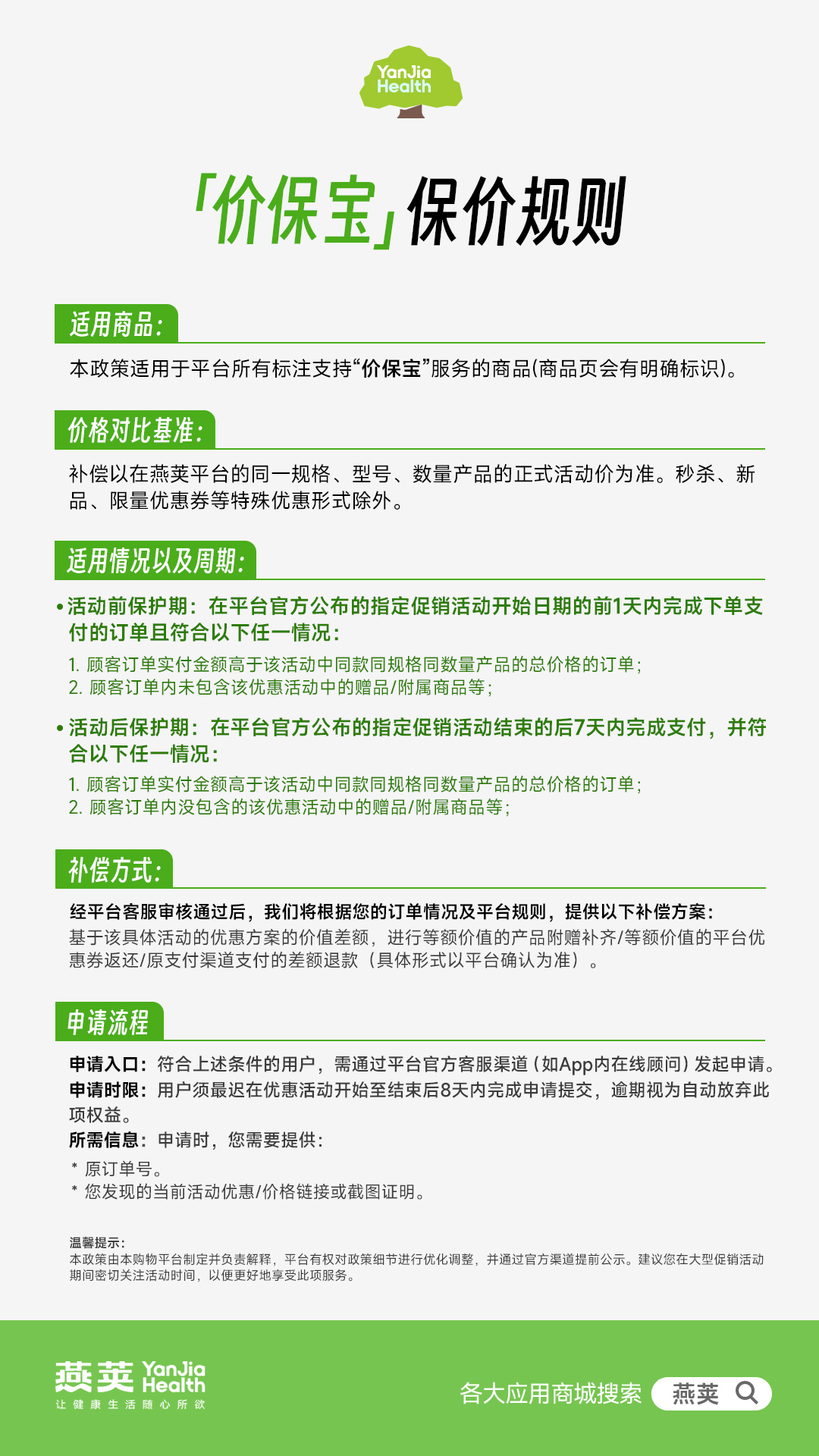 极简申请流程 衔接全链路健康服务 为让消费者轻松享受权益,「价保宝」设置了便捷的申请流程。符合条件的用户需在优惠活动开始至结束后 8 天内,通过燕荚 App 内在线顾问等官方客服渠道发起申请,同时提供原订单号及活动优惠价格链接或截图证明即可。简洁的操作流程与平台专业的健康管理服务体系相呼应,实现购物保障与健康服务的无缝衔接。