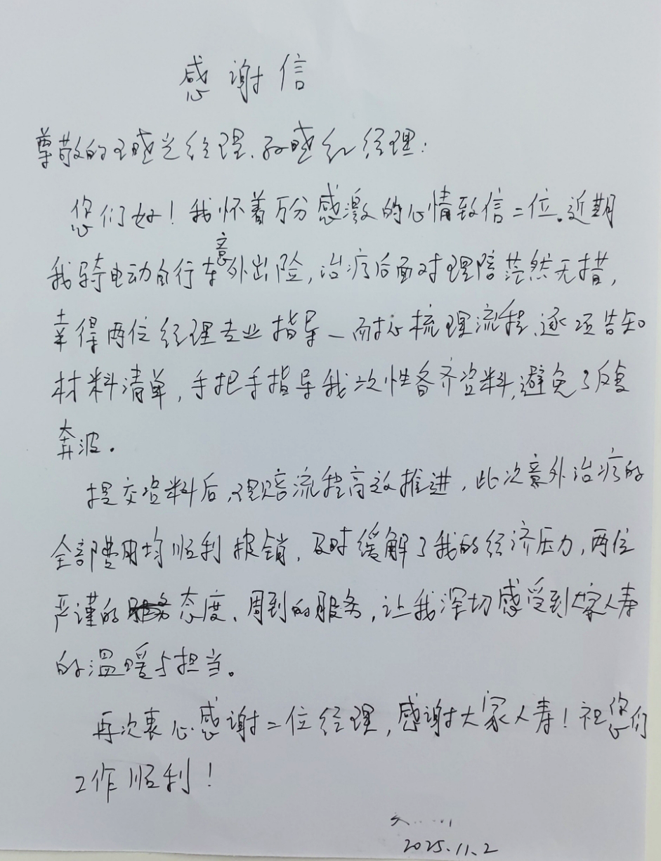 两位经理全程为客户提供 “一对一” 专属指导,从材料准备到流程推进都细致协助。有了这份贴心协助,吴女士没因材料问题多跑一趟,心里的焦虑很快消散。 资料提交后,潍坊中支立刻启动快速理赔通道,各环节衔接顺畅,全程高效推进。次日,相应治疗费用全额理赔到账,既有效缓解了吴女士的经济压力,更让她和家属因这份专业帮忙倍感省心安心。为表谢意,家属专程前往潍坊中支,送上手写感谢信与锦旗。