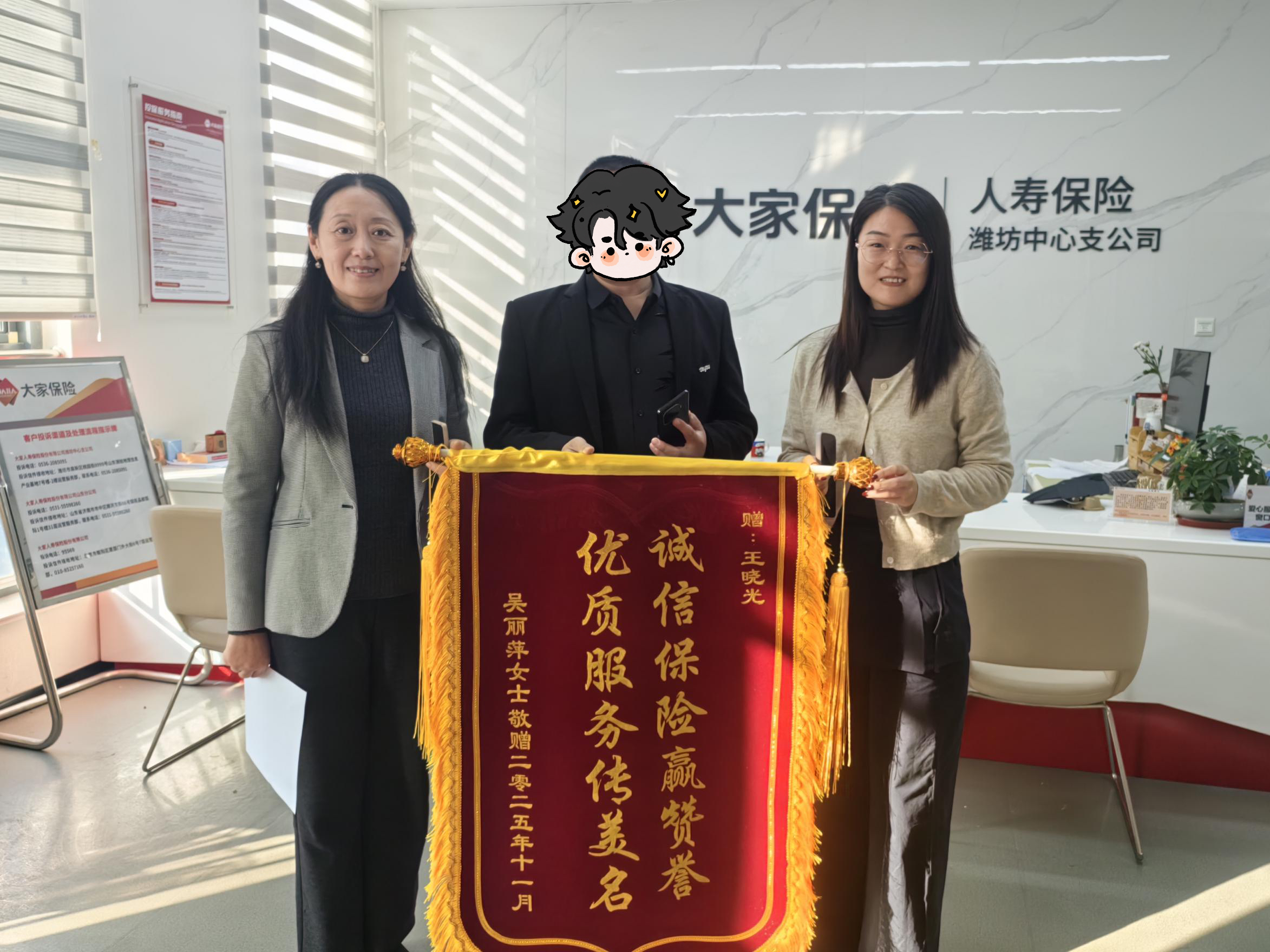 信中吴女士真挚写道:“意外出险后我面对理赔茫然无措,幸得两位经理专业指导,手把手帮我备齐资料,高效的理赔服务及时缓解了我的经济压力,二位严谨的态度、周到的服务,让我深切感受到大家人寿的温暖与担当!” 锦旗上 “诚信保险赢赞誉,优质服务传美名” 的字样,既是对二人工作的高度肯定,也是对潍坊中支服务品质的有力见证。 金杯银杯,不如群众的口碑。每一面锦旗背后,都是一段关于信任与责任的故事。未来,大家人寿潍坊中支将继续以快响应守护客户权益,用暖服务传递保险温度,为更多家庭筑牢平安防线。 |