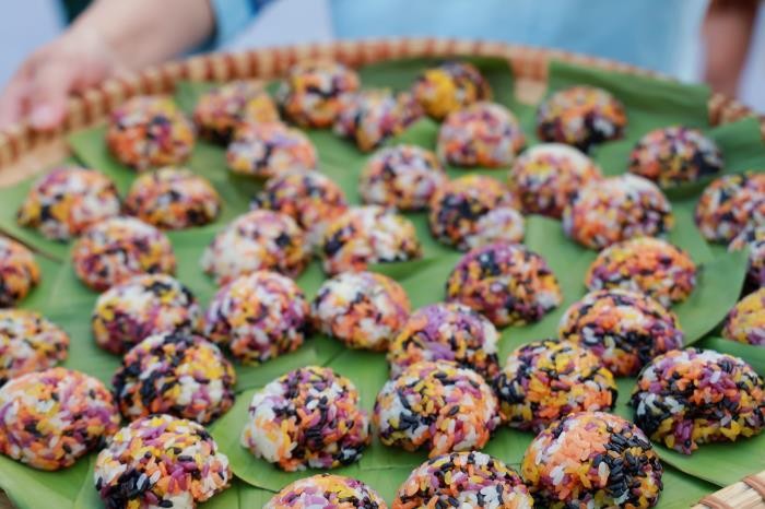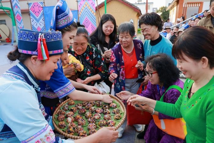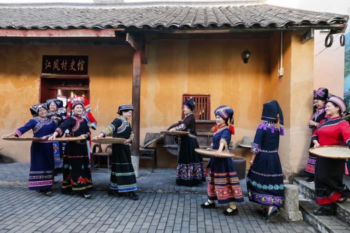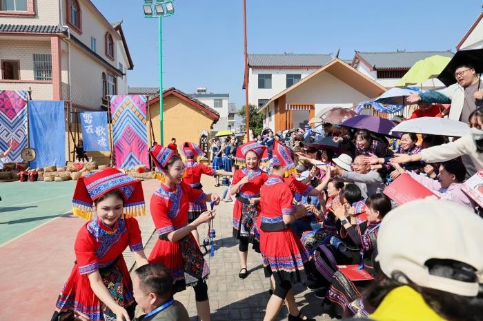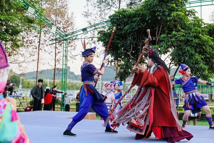 演出突破传统剧场限制,充分利用那西屯的自然景观,从榕树广场延伸至村舍田野,构建出多维沉浸式观演空间。观众在剧情推进中参与寻宝、对歌、舞蹈等环节,亲身体验非遗魅力。剧中核心文化符号“麽乜”是壮族传统文化中的护身符,被赋予“平安祝福”的寓意。该剧通过邀请观众参与寻宝、斗歌、共跳竹竿舞、品尝五色糯米饭等互动环节,充分调动观众五感,实现从“观看者”到“体验者”的转变。“观众不再是旁观者,而是故事的亲历者,”该剧艺术总监梁汉昌表示,“我们希望通过沉浸式叙事,让传统文化在实景田野中焕发新生。”