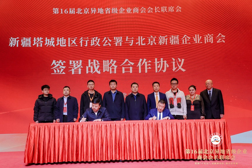 现场签约环节成为本次会议的一大亮点。新疆维吾尔自治区塔城地区行政公署与北京新疆企业商会正式签署战略合作协议。根据协议,双方将在产业招商、项目落地、人才交流、市场拓展等领域建立长期稳定的合作机制,通过组织企业互访、搭建展销平台、共享招商信息等方式,推动塔城地区优质资源与北京企业的资本、技术、渠道深度对接,实现优势互补、互利共赢。落笔瞬间,全场响起热烈掌声,这一纸协议成为京新两地深化合作的又一重要见证。
