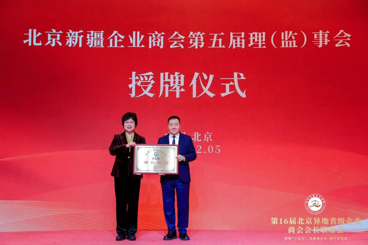 北京陕西企业商会会长江榕代表北京异地省级企业商会会长发言 会上,备受关注的北京新疆企业商会第五届理(监)事会授牌仪式正式举行,在全场嘉宾的见证下,相关领导依次为新一届理(监)事会领导班子授牌。接过沉甸甸的牌匾,新一届理(监)事会领导神情庄重,这不仅是一份荣誉,更是一份沉甸甸的责任与使命,标志着北京新疆企业商会迈入更加规范化、专业化、高质量发展的新阶段。