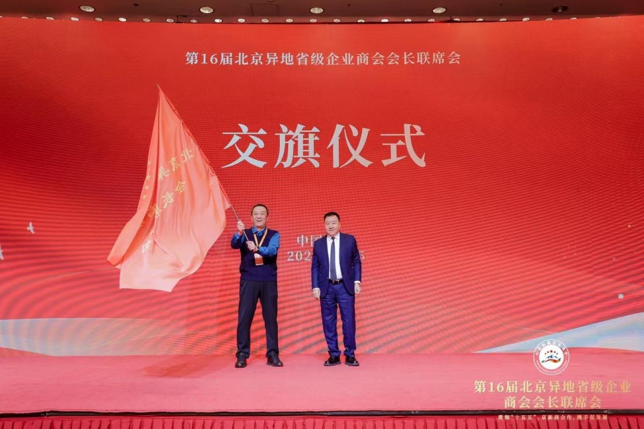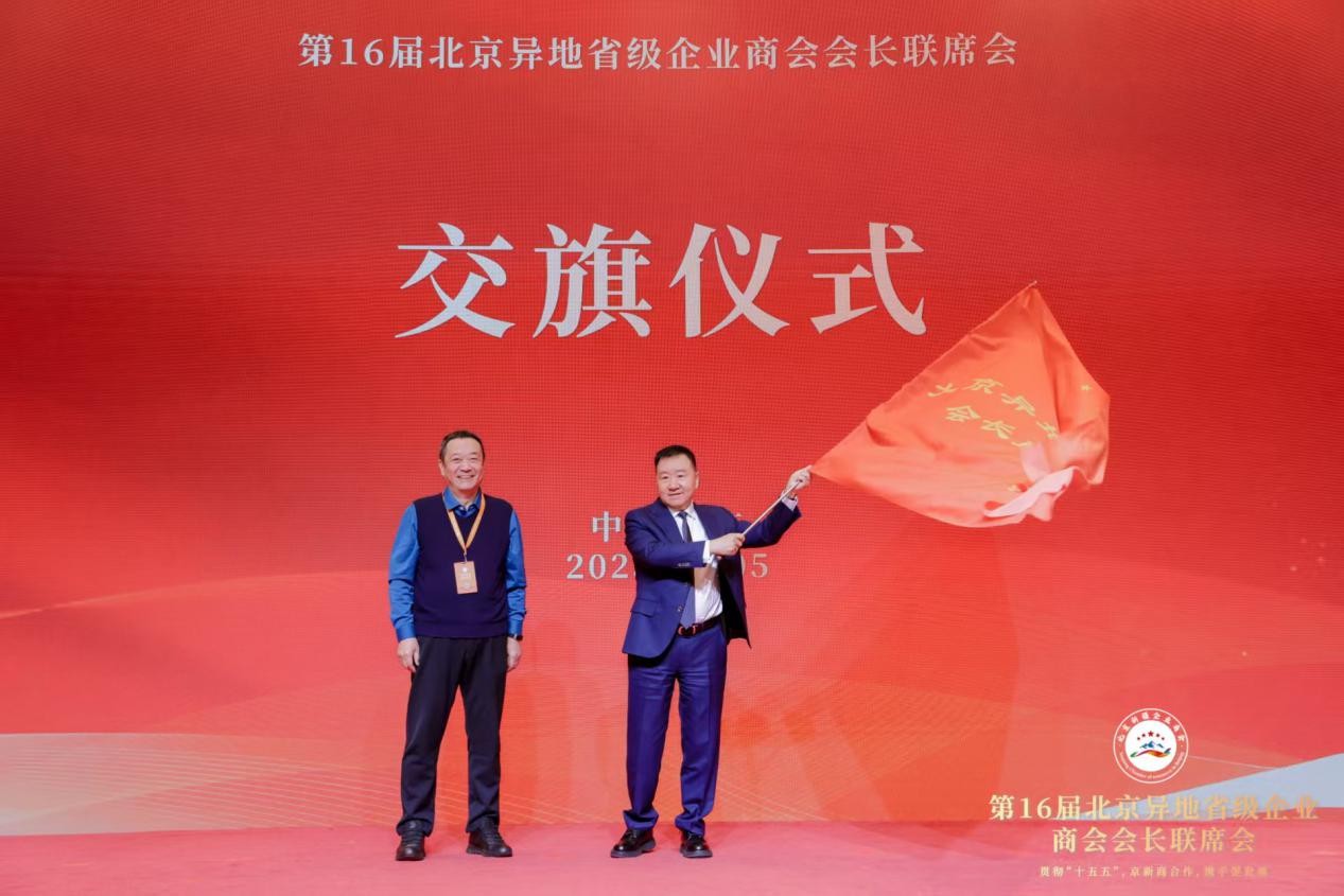 会议最后,举行了简洁而庄重的交旗仪式。北京新疆企业商会会长丁国进将北京异地省级企业商会会长联席会的会旗郑重交至17届北京异地省级企业商会会长联席会举办方北京陕西企业商会会长江榕手中,旗帜的交接象征着责任的传承与使命的延续、砥砺前行、再创辉煌。仪式结束后,全体与会人员集体合影留念,定格下这一凝聚共识、共启新程的重要时刻。