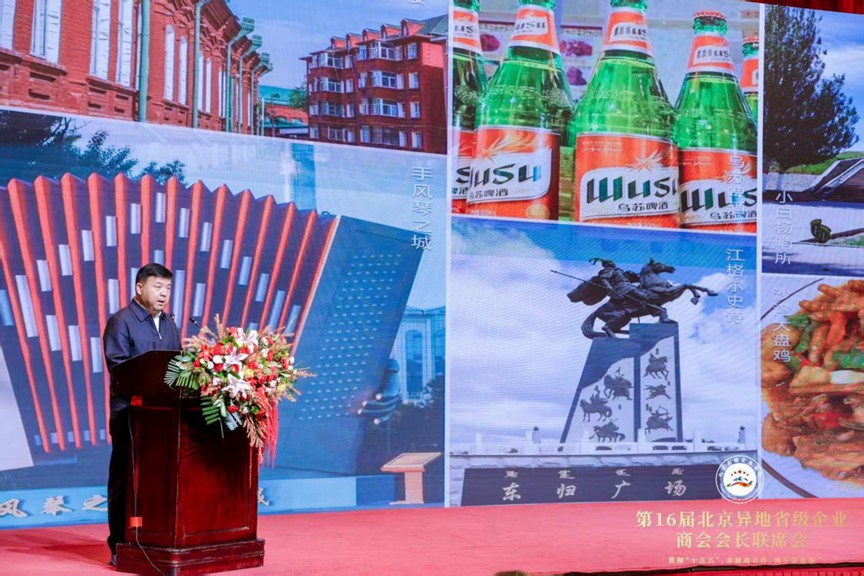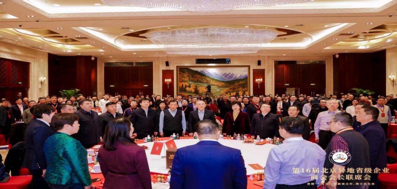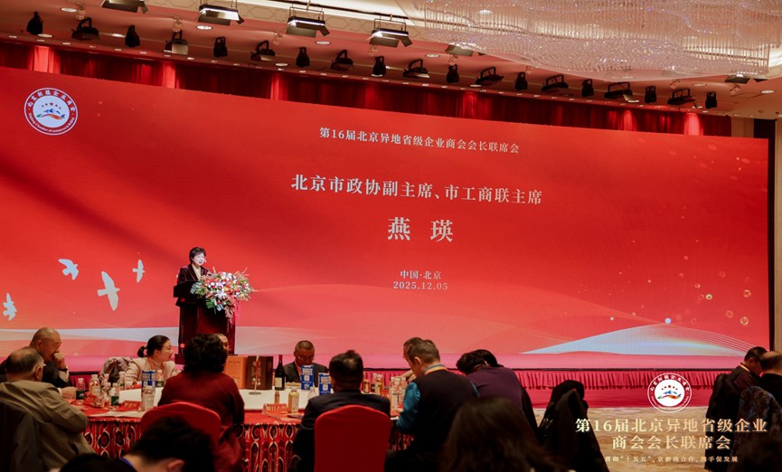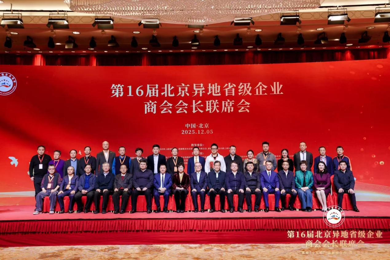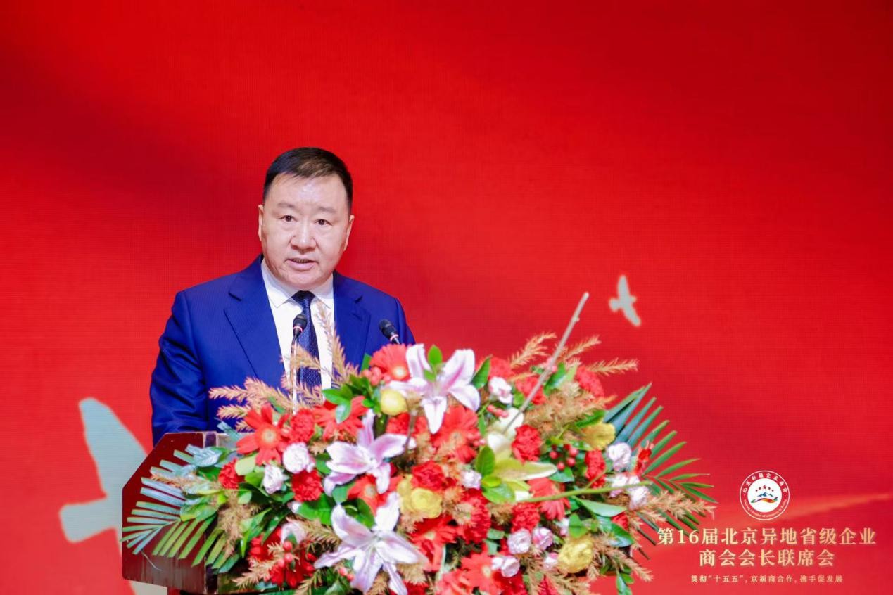 为深入贯彻党的二十届四中全会精神,奋力开启“十五五”规划谋篇布局,由北京工商业联合会、新疆维吾尔自治区工商业联合会、新疆生产建设兵团工商业联合会为指导单位,北京异地省级商会主办,北京新疆企业商会承办的第十六届北京异地省级企业商会会长联席会于2025年12月5日在新疆维吾尔自治区人民政府驻北京办事处北京新疆大厦召开。本次会议以“贯彻“十五五”,京新商合作,携手促发展”为主题,汇聚各方智慧,凝聚合作共识,积极响应国家区域协调发展战略,携手壮大民营经济,推动高质量发展。 本次会议恰逢北京新疆企业商会第五届理(监)事会换届后首次举办的商会大型活动,既是商会发展历程中的重要里程碑,更是京新两地深化经贸协作、异地商会凝聚发展合力的重要平台。 第十三届全国人大常委会副委员长、中国阿拉伯友好协会会长艾力更·依明巴海,中国社会工作联合会会长陈存根,北京市政协副主席、市工商业联合会主席燕瑛,新疆维吾尔自治区人民政府驻北京办事处党组书记、主任张刚,新疆维吾尔自治区党委统战部副部长、工商业联合会党组书记刘斌,新疆维吾尔自治区商务厅党组成员、副厅长居来提·肉孜,新疆生产建设兵团商务局党组成员、副局长葛玉红,新疆维吾尔自治区工商业联合会党组成员、副主席斯日古楞,新疆维吾尔自治区塔城地区行政公署副专员斯坎旦·克尤木等领导出席会议,新疆各地州驻京联络处负责人,新疆各地州驻京招商局负责人,央企、国企、金融机构、上市公司、五百强企业以及来自北京异地省级企业商会和异地新疆省级企业商会的会长、秘书长及代表共计330余人齐聚一堂,共叙合作情谊,共话发展蓝图。