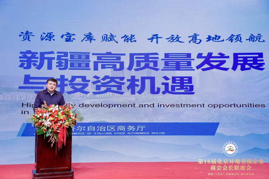 北京市政协副主席、市工商业联合会主席燕瑛为北京新疆企业商会会长丁国进授牌 为让在京企业更好地了解新疆发展机遇,新疆维吾尔自治区商务厅党组成员、副厅长居来提·肉孜同志,新疆生产建设兵团商务局党组成员、副局长葛玉红,新疆维吾尔自治区工商联党组成员、副主席斯日古楞同志,新疆维吾尔自治区塔城地区行政公署副专员斯坎旦·克尤木同志先后进行项目推介。推介环节中,各位领导围绕新疆特色农业、新能源、文旅康养、口岸经济、纺织服装等优势产业,详细介绍了当地的资源禀赋、产业基础、政策支持及重点合作项目。从自治区的新能源产业布局、新疆生产建设兵团的绿色农产品产销基地、新疆南疆五地州产业发展到塔城地区的跨境物流枢纽建设,一个个潜力巨大的合作项目、一项项务实给力的扶持政策,让在场企业家们眼前一亮,为大家投资新疆、参与新疆建设提供了清晰的方向指引和宝贵的合作契机。现场互动频繁,不少企业家认真记录、主动咨询,对赴疆投资兴业表现出浓厚兴趣。