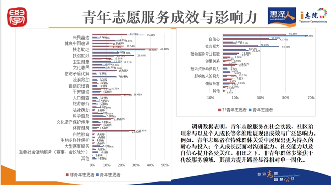 实践案例百花齐放:青年志愿创新赋能社会治理 在案例分享环节,五位嘉宾带来了兼具实践深度与理论高度的精彩分享,为现场观众呈现了一场干货满满的 “知识盛宴”。 1.青年志愿服务现状:成效与挑战并存 惠泽人专业志愿者、西安交通大学副研究馆员雒虹老师及人文学院社会工作研究生丁小楠在会上发布了基于2024年中国志愿服务发展指数的青年志愿服务调研报告。报告显示,青年志愿者以19-22岁群体为主(占比63.95%),女性参与度显著高于男性。青年志愿者在社会实践、社区治理与个人成长等方面表现突出,参与频率与满意度均高于非青年群体,展现出积极的志愿服务风貌。然而,青年志愿服务仍面临资金来源单一、项目同质化、应急响应能力不足、专业队伍建设滞后等挑战。 通过详实的数据与系统的分析,梳理了当前青年志愿服务的发展现状、典型特征与优化方向,为行业发展提供了坚实的理论支撑;