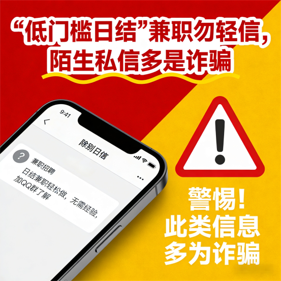 在各类社交平台与短视频平台上,“无需经验、日结工资、在家轻松赚钱”的兼职广告层出不穷,看似诱人的条件背后,往往藏着诈骗分子精心设计的陷阱。哈啰臻有钱在此郑重提醒:面对“低门槛日结”的兼职诱惑,务必保持清醒,尤其是陌生私信推送的兼职信息,更要多留一个心眼。