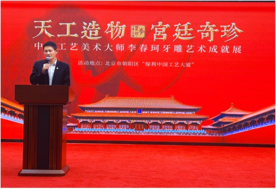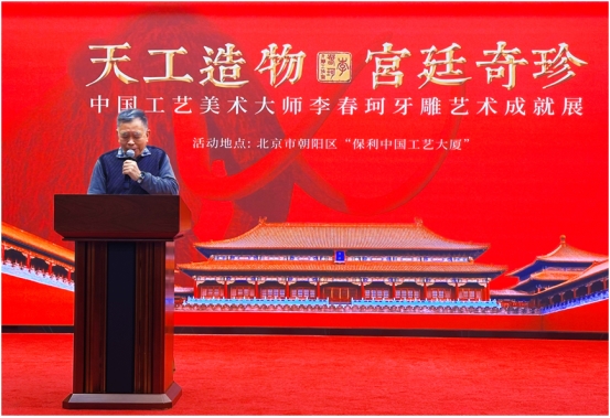 中藏文博艺术品评估中心董事长周天意发言 中藏文博艺术品评估中心董事长周天意在发言中讲到:像我们李大师这样既传承宫廷牙雕技艺,又能将南北牙雕技艺相融合的国大师,全中国仅有李春珂大师一人。