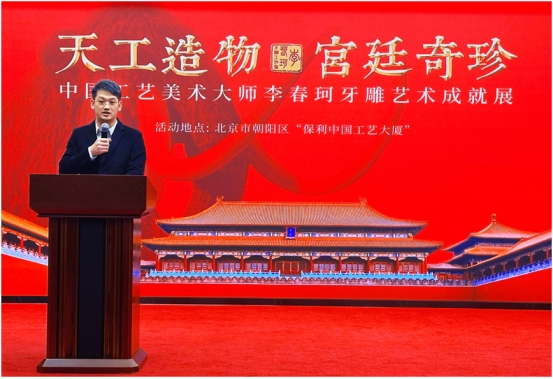 保利中国工艺领导张金鸽发言 本次李春珂大师猛犸牙雕成就展还特别邀请了保利中国工艺领导张金鸽先生;中国工艺美术大师、国家级非物质文化遗产项目象牙雕刻代表性传承人李春珂大师;中藏文博艺术品评估中心董事长周天意先生;中国东方文化研究会社会艺术专业委员会副会长、国家非遗技艺传策人孙松林先生;抖音《中国工艺•非遗溯源》项目主理人徐浩先生等行业专家领导以及艺术机构代表。
