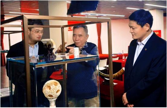 李春珂大师、周天意董事长、保利中国工艺领导张金鸽鉴赏牙雕作品 活动现场,李春珂大师、张金鸽先生、周天意董事长围绕着牙雕的传承与发展展开了深度探讨:一是在新时代背景下,如何让猛犸牙雕作品深度融入时代文化、彰显时代精神、展现时代面貌,实现传统艺术与当代审美的同频共振;二是面对猛犸象牙这一不可再生资源日渐稀缺的现状,如何以守正创新为核心,既传承千年牙雕的精湛技艺,又通过题材拓展、形式创新与人才培养,为这门非遗技艺开辟可持续的发展路径。