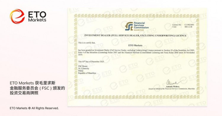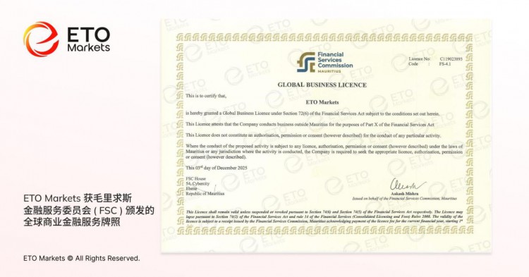 ETO Markets 宣布已获得毛里求斯金融服务委员会(FSC)颁发的金融服务牌照(牌照编号:C119023893)。此监管许可进一步巩固了平台在透明运营、稳健合规与客户保障的承诺,更标志着ETO Markets 在全球化与智能交易体系建设上的持续推进。