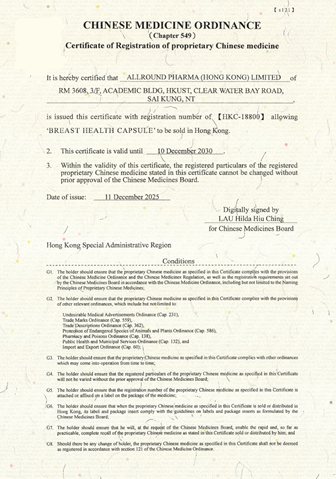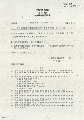 2025年12月11日,白鹿制药核心妇科中成药乳舒康膠囊【種福堂】(内地药品名称:乳癖散结胶囊)正式获得香港特别行政区政府签发的中成药注册证明书(注册编号:HKC-18800)。